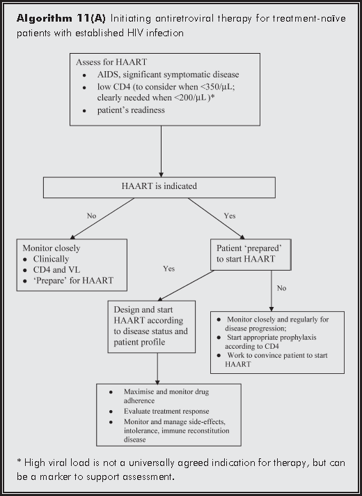The symptomatic patient - HIV-associated symptoms are indications for HAART. However, the urgency varies according to clinical circumstances. A relatively high CD4 count and mild symptoms, e.g. those corresponding to the CDC 'B' category, will allow time for full evaluation and counselling of the patient before optimal treatment is designed and initiated. This will enhance patient adherence in the future. On the other hand, certain opportunistic infections are potentially fatal unless significant immune reconstitution occurs. In these cases, HAART will be more urgently needed. Of note, in those with tuberculosis and a CD4 count >100/μL, treatment should normally be delayed until two months into antituberculous treatment to minimise the occurrence of immune reconstitution disease,4 the latter is described in another chapter (Chapter 15).