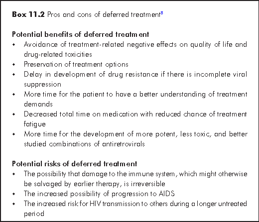 The asymptomatic patient - The first antiretroviral regimen carries the best chance of success. Its timing is therefore crucial. In those with symptomatic disease, the cut-off CD4 threshold for treatment initiation is subject to debate. Currently, most authorities suggest that treatment should be initiated with the CD4 count in the range of 200 to 350/μL. This recommendation is based on a multitude of studies comparing mortality based on treatment initiation at various CD4 thresholds. While mortality rises in those with treatment started at a CD4 below 200/μL, it does not significantly differ between those started between 200-350/μL and those started above 350/μL. Within the range between 200 and 350/μL, initiation will depend on the patient's motivation, viral load, and the rate of CD4 decline. These are guidelines meant for reference, as all clinical decisions should be individualised. The pros and cons of early (CD4 >350/μL) and deferred (CD4 200-350/μL) should be communicated clearly to patients to facilitate an informed decision (Box 11.2). In Hong Kong, this issue is complicated by the finding that local Chinese5,6 have a lower natural CD4 level than Caucasians. Hence the cut-off CD4 values recommended for starting ART in some western countries may be overaggressive in Chinese.7